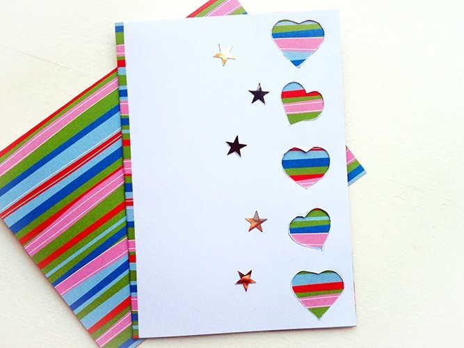 NOCH nicht. Herzen mit buntem Papier hinterkleben. Aus dem gleichen Papier einen