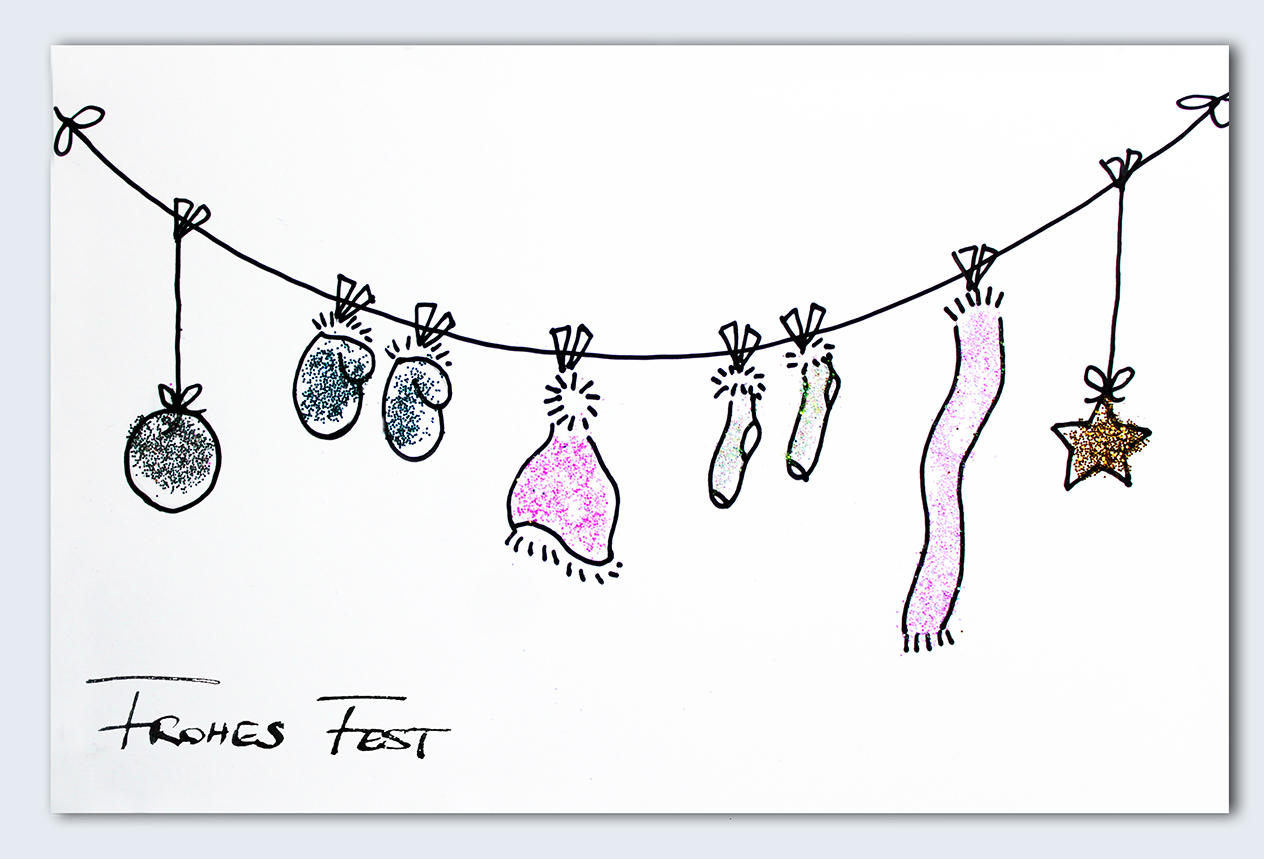die Formen mit Klebestift und Glitter aus. Weihnachtsgruß darunter. Fertig!