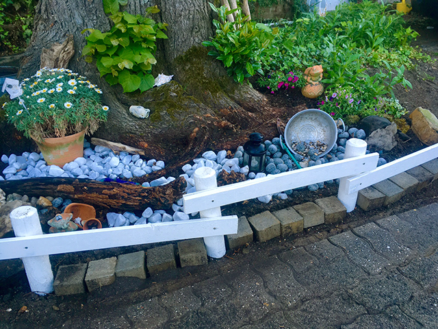 Zu ihren Füßen habe ich mit meiner Schwiegermutter einen kleinen Vorgarten angelegt. Hübsche Steine, hübsche Töpfe mit hübschen Blumen, eine hübsche Bank. Hübsche Zwergerl und so Zeuch und det Janze umrahmt von einem – ihr ahnt es – hübschen Zaun. So war es jedenfalls mal. Am Anfang. Bevor der Sommer und dann der Herbst kam.