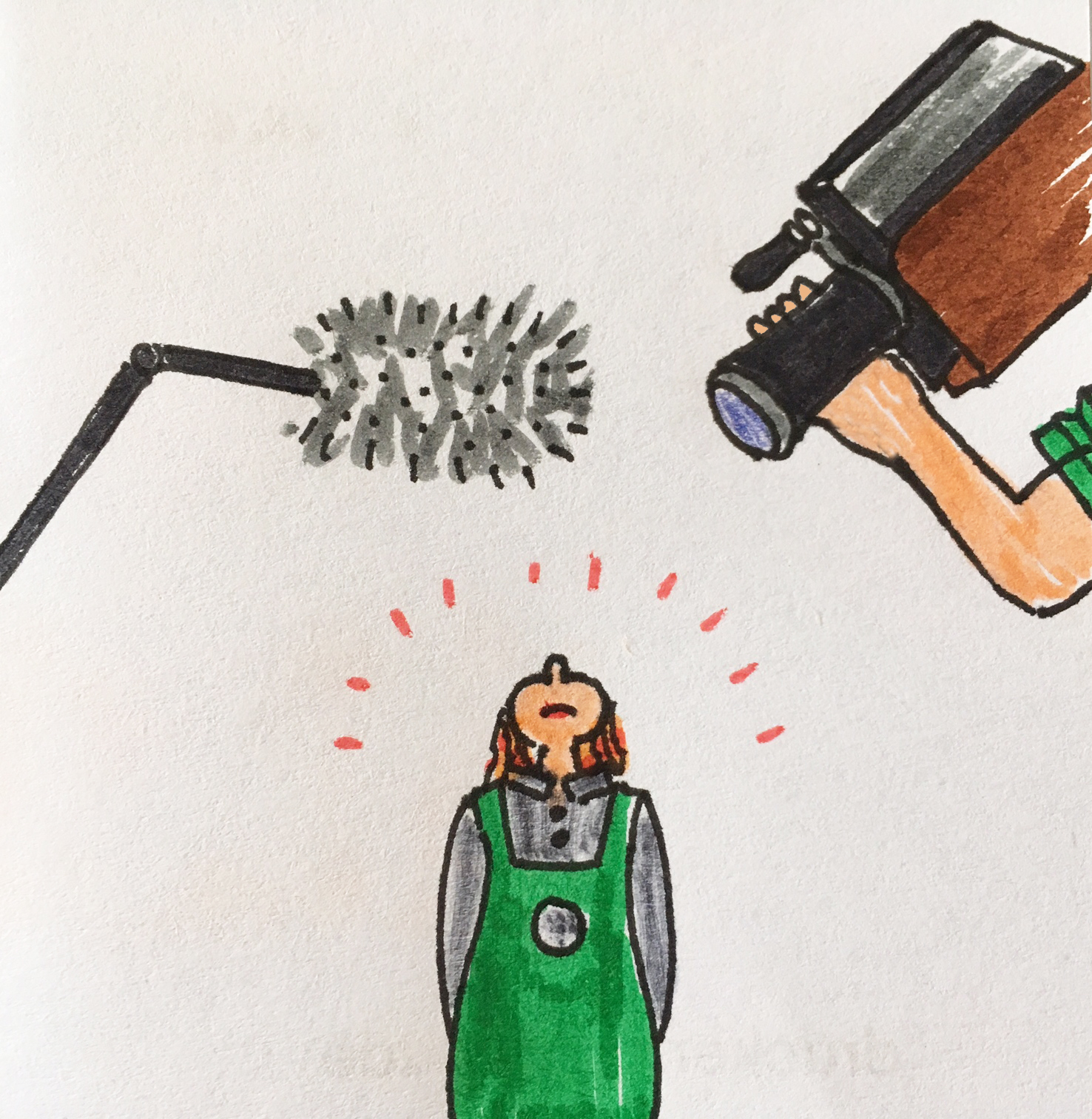 Ich drehte mich um und stand tatsächlich Aug in Aug mit einem beeindruckenden Exemplar. Versteckt war sie allerdings nicht, dafür war sie viel zu groß. Hintendran hing ein Kamerateam und über mir schwebte ein Mikrofon an einer Angel. Ich schluckte und sah hilfesuchend zum Boss. Die zog eine Augenbraue bis fast unter die Haarspitzen und rief gekünstelt: „Husch, husch nach oben. Umziehen. Hier wird heute gedreht. Du bist gleich dran.“ „Ähhh…“, wollte ich einwenden, ließ es aber, als ich ihren Blick sah und verzog mich in die Umkleide.
